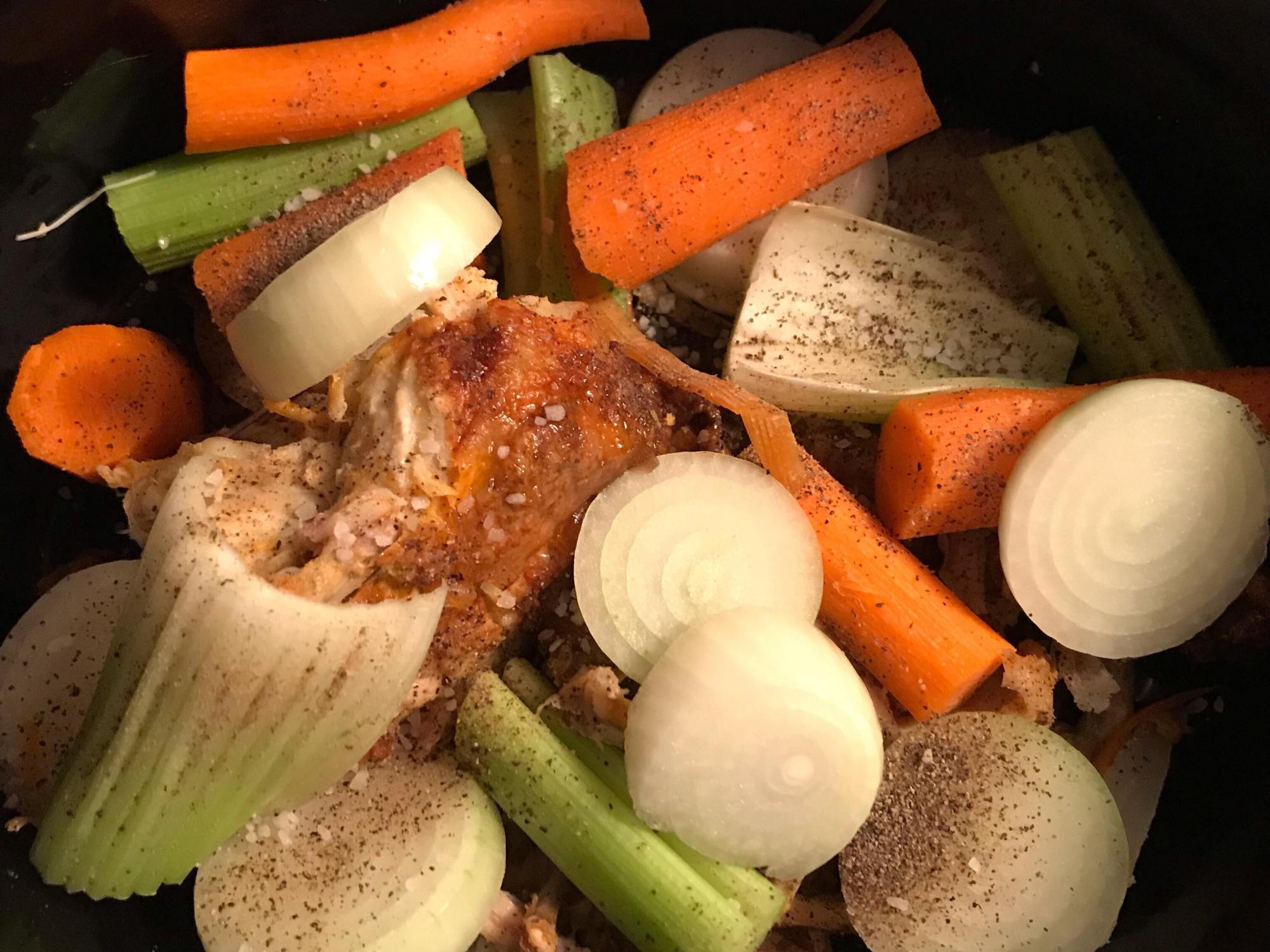 - Déposer la carcasse de poulet dans la mijoteuse.