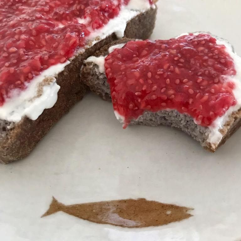 - J’ai fait la recette de pain de Diet Doctor pour accompagner la confiture. Au lieu de les faire en « buns », j’ai fait un vrai pain dans un moule et je le coupe en tranches.