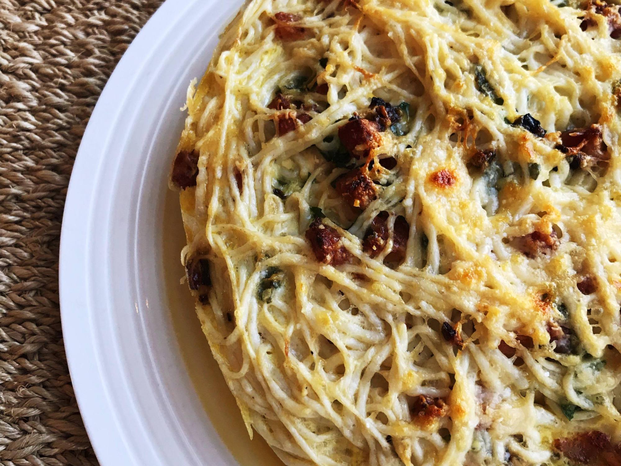 - Dans le grand bol, incorporer la pancetta les oignons verts, les oeufs, la moitié du parmesan et la moitié du persil frais. Saler et poivrer généreusement. Bien mélanger.