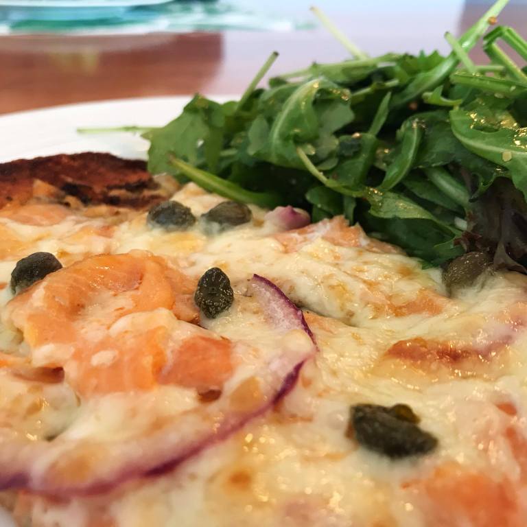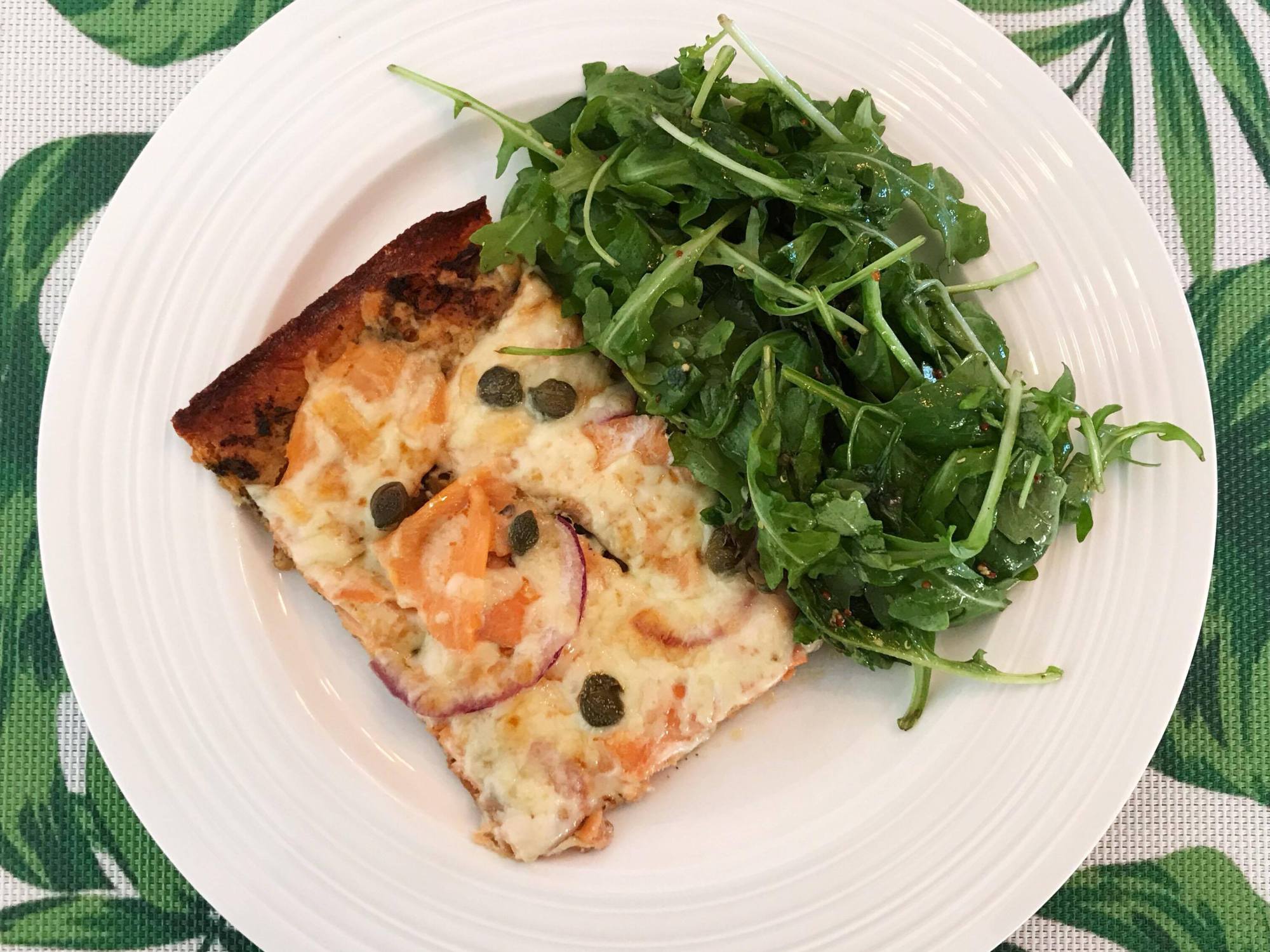- Pendant ce temps, étendre le pesto sur la pâte à pizza. Ajouter le saumon fumé, les oignons rouges, le reste du fromage mozzarella et les câpres.