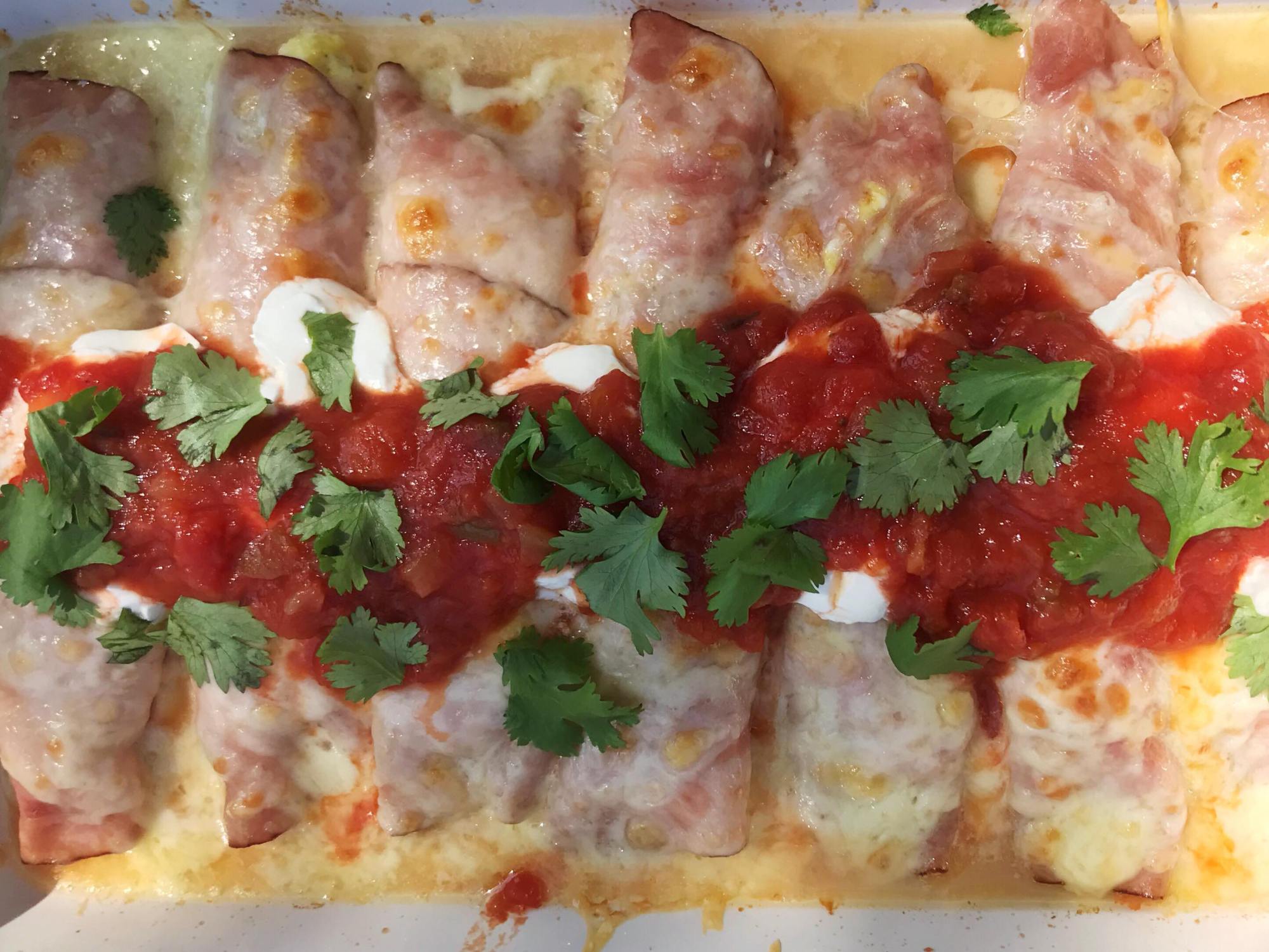 - Supperposer au centre deux tranches de jambon pour créer une grande tranche. Ajouter les oeufs et rouler. Déposer l’ouverture des rouleux de jambon face contre le plat de cuisson.